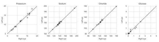 The results of whole vitreous samples collected from the right and left eye correlated well (Figure 7). Linear regression showed r2 of 0.95–0.99 with a slope coefficient of 0.93–1.02. There were no significant differences in the concentration of any of the solutes between the two groups of samples (Mann–Whitney U-test, p > 0.05).