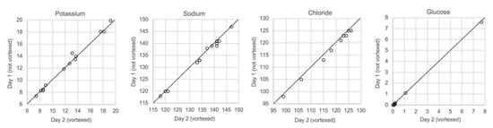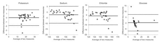 In Figure 8, the effects of spiking postmortem vitreous samples with electrolytes and glucose are shown. At higher concentrations, the measured sodium and chloride concentrations showed a trend towards higher values than the calculated concentration. However, as can be seen in the Bland–Altman plots, there was only little overall bias between the measured and calculated values for each of the analytes.