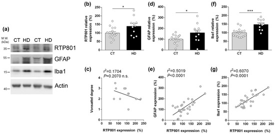Previous results from our lab showed that RTP801 levels are increased in brain homogenates obtained from HD patients putamen and cerebellum [29,39]. Here, in human post-mortem hippocampal lysates, we found that RTP801 protein levels were significantly increased in HD patients compared with controls (Figure 1a,b). No significant correlation was found between RTP801 levels and Vonsattel grades (Figure 1c). GFAP (a marker of astrocytes) and Iba1 (a marker of microglia) levels were increased in HD patients (Figure 1d,f) and positively correlated with RTP801 levels (Figure 1e,g), further suggesting that RTP801 levels could be a marker of gliosis in HD [35].