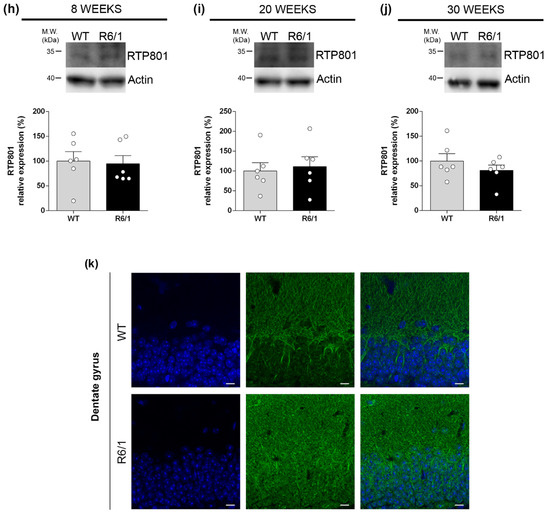 Altered RTP801 levels were previously detected in striatal samples from the HdhQ7/Q111 and R6/1 HD mouse models [29]. Here, we investigated whether hippocampal RTP801 levels were altered during the progression of the disease in R6/1 mice: presymptomatic (8 weeks of age) and when they already display motor dysfunction and memory impairments (20 and 30 weeks of age) [41,42]. No differences in total hippocampal RTP801 levels between WT and R6/1 mouse were detected (Figure 1h–j). However, RTP801 staining pattern is altered in the hippocampus of the R6/1 model, suggesting a differential intraneuronal redistribution (Figure 1k).