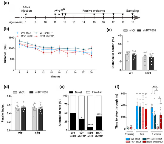 Next, we analyzed spontaneous alternation in a T-maze task, 2 h after habituation. We observed reduced cognitive flexibility in the R6/1 shCt group, since they showed no tendency to modify their response and explore the novel arm. This parameter was rescued in shRTP801-injected R6/1 mice to levels similar to WT shCt and WT shRTP801 groups (Figure 2e) (χ2:2.020, p = 0.1552 vs. WT shCt and χ2:1.057, p = 0.3039 vs. WT shRTP801).