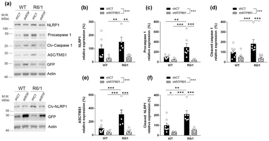 To understand the mechanism by which silencing RTP801 in hippocampal neurons diminished the inflammatory response in the R6/1 mice, we investigated whether the inflammasome receptor NLRP1 and its components were affected (Figure 5a). NLRP1 is mainly expressed in neurons [51] as pro-form and auto-proteolytic fragment (cleaved). Silencing neuronal RTP801 diminished the activation of NLRP1 (Figure 5b,c) in both WT and R6/1 mice. Moreover, this significant reduction was accompanied by a reduction of the levels of the procaspase 1 (Figure 5e), its cleaved form (Figure 5f), and the inflammasome adaptor ASC/TMS1 (Figure 5d).
