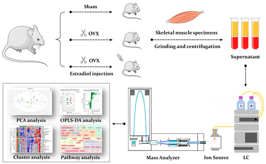 A schematic diagram illustrating the experimental design. We performed an untargeted metabolomics profiling and pathway analysis on skeletal muscle samples of the three groups (sham surgery, ovariectomy, and estradiol-treated group).