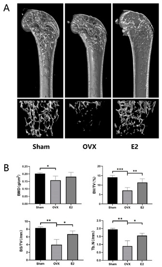 Quantitative bone morphometric parameters of bone mineral density (BMD, g/cm2), bone volume to total tissue volume (BV/TV), bone surface to tissue volume (BS/TV, mm−1), and trabecular number (Tb.N., mm−1) were measured. Three-dimensional reconstructions of the femoral bone tissue showed a significant reduction in bone volume, trabecular bone loss and all the measured quantitative bone morphometric parameters after bilateral ovariectomy in the OVX group (Figure 2A,B). On the contrary, treatment with estrogen can restore OVX-induced bone loss and trabecular bone deterioration and showed an increasing trend of all the measurements (Figure 2A,B).