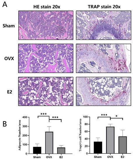 Photomicrographs of femurs. (A) Representative histological assessment of mouse femur sections stained for H&E and TRAP activity (20X magnification). (B) Quantitative assessment of the total number of adipocytes and TRAP+ cells per bone surface were conducted. Values presented as the mean ± standard deviation (n = 3); * p < 0.05, *** p < 0.001.