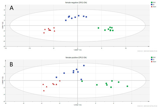 To investigate the metabolic differences among the Sham, OVX, and E2 groups, OPLS-DA analysis was conducted, and the results are illustrated in Figure 4 (Positive mode: R2X = 0.667, R2Y = 0.868, Q2 = 0.727; Negative mode: R2X = 0.781, R2Y = 0.94, Q2 = 0.76). OPLS is a regression modeling method of multiple dependent variables to multiple independent variables. It can recognize the most constructive ions to the clustering of samples as well as remove the irrelevant data variation from the data set [37]. Score plots from OPLS-DA analysis indicate that there exists a separation among the Sham, OVX and E2 groups. The samples in the same group showed a good clustering trend. Moreover, there was a tendency of E2 group approaching to the Sham group comparing to OVX group, indicating that E2 treatment partially restored the metabolic changes induced by OVX surgery.