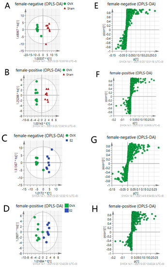 OPLS-DA score plots of Sham, OVX and E2 group (A–D) and their corresponding S-plot (E–H). Promising degree of fitting and predictive ability make it reliable to screen the differential variables between groups: (A,E) OVX vs. Sham in negative mode; (B,F) OVX vs. Sham in positive mode; (C,G) OVX vs. E2 in negative mode; (D,H) OVX vs. E2 in positive mode. S-plot shown in (E–H) is composed of ions separating according to the contribution of the ion on the difference between two groups. Each ion is presented as one point in the s-plot. The further the point is to the original point, the more impact the ions have on the differentiation of two groups and thus has the bigger VIP value.