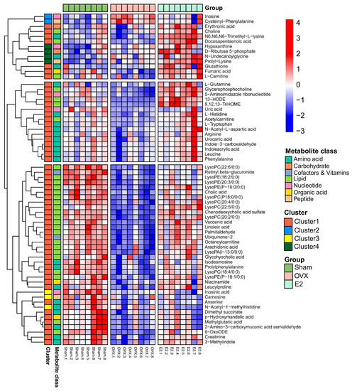 The clustering heatmap of Sham, OVX and E2 group based on the 65 differential metabolites in skeletal muscle.