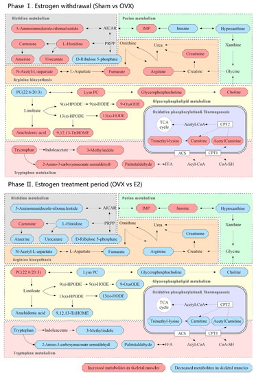 Metabolic pathways related to the differential metabolites identified in the Sham, OVX and E2 group. Phase Ⅰ: Estrogen withdrawal (Sham vs. OVX); Phase Ⅱ. Estrogen treatment period (OVX vs. E2).