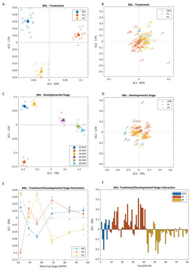 Scores (A,C) and loadings (B,D) ASCA plots for the first and second SC, and longitudinal scores (E) and loadings (F) plots for SC1, for BAL vineyard. Plots (A,B) correspond to factor Treatments, (C,D) to factor Developmental Stage, and (E,F) to the model’s interaction term. A list of variables used in loadings plots (B,D,F) can be found in Supplementary Table S5. SC stands for simultaneous component; ND, no defoliation; ED, early defoliation; LD, late defoliation; CAR, carotenoids; FV, free volatiles; PP, polyphenols; DAF, days after flowering. Filled symbols indicate group centroids (A,C).