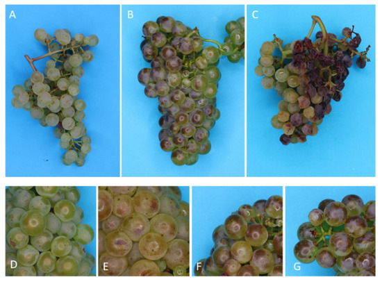 Bunches exhibiting varying degrees of sunburn damage. Above: Bunches exhibiting no damage (A), sunburn browning (B) and sunburn necrosis (C). Below: varying degrees of sunburn browning: (D) SB0, (E) SB1, (F) SB2 and (G) SB3.