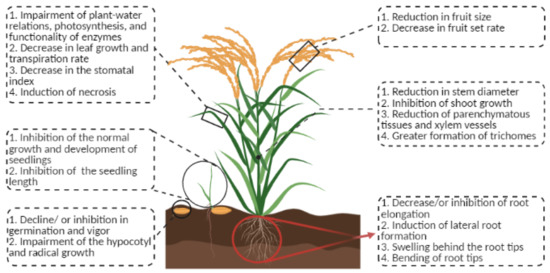 The effect of HM toxicity can be observed on almost all the plant tissues and at all the stages of plants’ life cycle starting from seed germination to senescence; however, these effects are more pronounced during seed germination and root growth. Since seed germination is sensitive to physicochemical conditions of the rhizosphere, decline in seed germination and vigor and subsequent seedling growth have been reported under HM toxicity in most cases [13]. In particular, Pb-toxicity has been shown to induce adverse effects on seed morphology, physiology, germination, and early crop growth in a variety of crops including Raphanus sativus [14], Lens culinaris [15], Oryza sativa, Hordeum vulgare [14], Elsholtzia argyi [16], Spartina alterniflora [17], Vigna radiata [18], Medicago sativa [19], and Zea mays [20], as reviewed previously [21]. In addition to Pb, exogenous application of other HMs also exhibits similar effects on seed morphology, physiology, and germination. For instance, a combined treatment of Cu and Cd to Solanum melongena severely reduced seed germination, seedling growth, and number of lateral roots [22]. Although the exact molecular mechanism of this HM toxicity-induced changes in seed physiology is not well understood, a growing body of evidence suggests that HMs cause inhibition of various enzymes which results in these changes. For instance, Hg-mediated inhibition of seed germination and embryo growth was found to be because of the direct interaction of Hg with the –SH group(s) of the proteins, resulting in the formation of a S-Hg-S bridge causing uneven modification in protein structures and thus loss of enzymatic activities [23]. Since the functions of certain enzymes such as amylases and proteases are crucial for seed germination, their inhibition affects the process of seed germination and subsequent hypocotyl and radical growth [16,17].