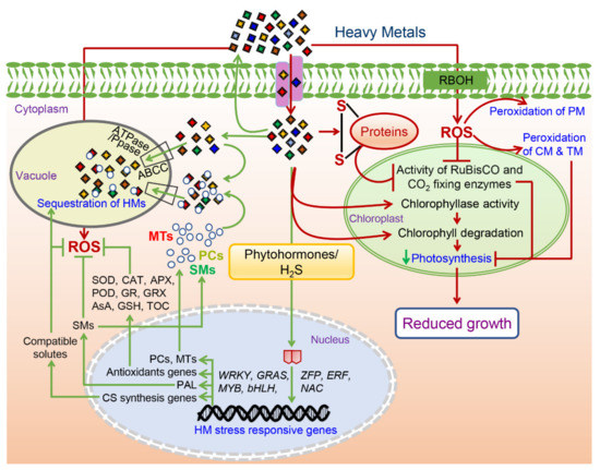 A putative diagram showing positive and positive molecular responses of the heavy metals (HM) toxicity in the plants. Responses marked with the red color represent negative effects of the HM toxicity while those marked with the green color represent tolerance response to alleviate the HM toxicity. Abbreviations: ROS—reactive oxygen species; SMs—secondary metabolites; CS—compatible solutes; PCs-phytochelatins; MTs—metallothioneins; SOD—superoxide dismutase; CAT—catalase; APX-ascorbate peroxidase; POD—peroxidase; GR—glutathione reductase; GRX—glutaredoxins; AsA—ascorbic acid; GSH—reduced glutathione; TOC—tocopherol; PAL—phenylalanine ammonia lyase; RBOH—respiratory burst oxidase homolog; PM—plasma membrane; CM—chloroplast membrane; TM—thylakoid membrane.