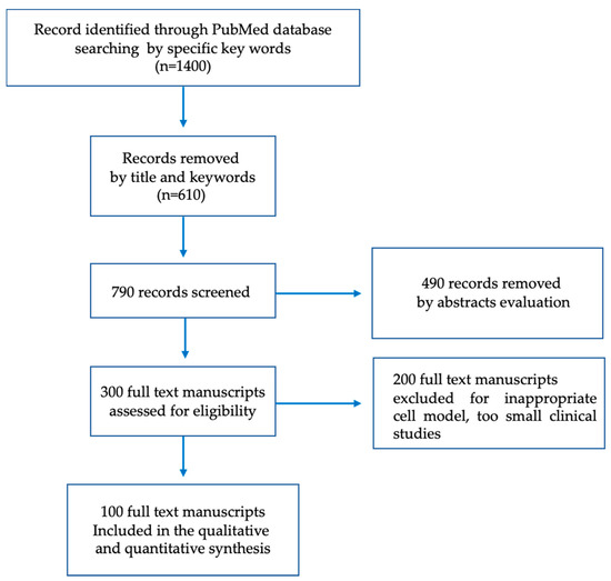 A systematic review of the literature was conducted using the following keywords: “Endocrine disruptors”, “Cardiovascular risk”, “Cadmium”, “Bisphenol A”, “Endothelium damage” and “Atherosclerosis” on the search engines “PubMed” and “Scopus”. Articles that were not related to the aim of this review and/or reported results using inappropriate cell models or a small number of patients were excluded. Two researchers, evaluating independently the titles and abstracts of the identified articles, performed the initial screening. A third evaluator was consulted when agreement between the two researchers could not be reached. The initial literature search identified a total of 1400 articles, and a manual screening of titles and keywords removed 610 records. After reviewing abstracts and full-text manuscripts, 100 papers fulfilling the above-mentioned search criteria were included. Figure 1 depicts the PRISMA flow diagram and the number of records included in the different phases of the review.
