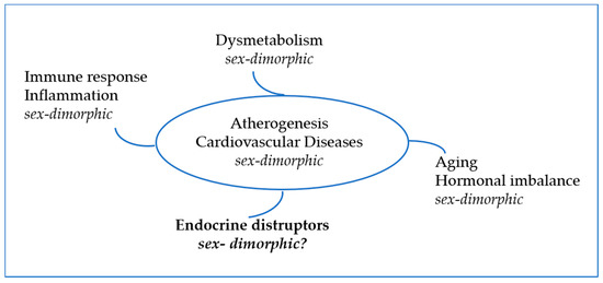 In conclusion, the published studies summarized here strongly indicate that Eds can trigger human health problems by interfering with hormonal pathways, inflammatory status and immune responses in both sexes. Since it is known that sex hormones might significantly alter the immune and inflammatory responses during the atherosclerosis process, causing different disease phenotypes according to sex, present data lead to the hypothesis that Eds might interfere with cardiovascular homeostasis by interfering with these processes (see Figure 2). For instance, women respond to infection and damage by an increase in both antibody and autoantibody responses, while men respond by an increase in innate immune activation, suggesting that, despite a well-known sexual dimorphism in the incidence and complications of atherosclerosis there are few data explaining the potential mechanisms underlying gender difference as a biological variable in CVD.