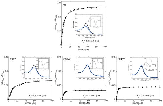 Similarly to the wild type, binding to E89Y causes a type I spectral change. This mutation marginally alters the affinity for the aglycone, but it halves the amplitude of the spectral transition, thus indicating the presence at the equilibrium of a minor population of enzyme, which is converted to the high spin state by 6DEB binding with respect to OleP wild type [28]. Binding of 6DEB to G92W and S240Y produced a spectroscopic shift different to what was expected, with a peak at 425 nm and a trough at about 410 nm, which is typical of Type II ligands, i.e., binders with inhibitory behavior (Figure 2) [7,29]. In these cases, the estimated KD values revealed some increase in 6DEB affinity with respect to the wild type.