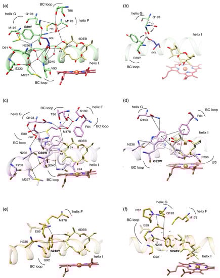 Structural changes in the solvent cavity of OleP mutants. Close up view of the changes in the solvent cavity induced by mutations at residues E89Y (panels (a,b)), G92W (panels (c,d)), S240Y (panels (e,f)). Right panels show the cavity in the orientation that better renders the differences between the mutant and wild type. Residues involved in contacts within 4 Å of distance are shown as sticks and labelled. Dashed lines indicate hydrogen bonds or π-interactions. Double conformations are reported, showing the less occupied conformer in transparency. Solvent molecules of glycerol (GOL) and formate ion (FMT) are labelled in italic. Heme and 6DEB are represented as red and khaki sticks, respectively; waters found in the structure of mutants are in red spheres, while those found in the wild type structure are in white spheres.
