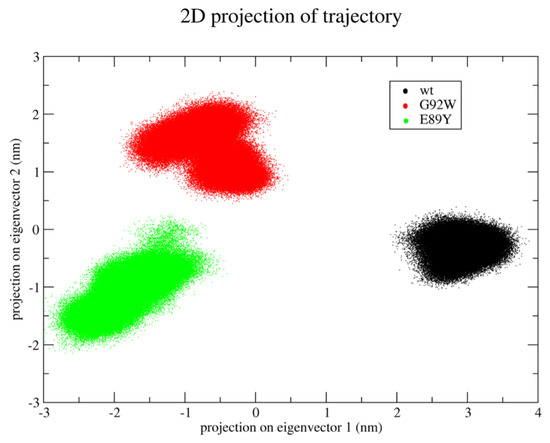 The essential dynamics analysis [22,23], a technique able to extract the principal molecular motions, has been performed on the trajectory formed by concatenating the trajectories of the three mutants to obtain a description of the conformations sampled by the three proteins on a common conformational space. This procedure has been extensively applied in previous works dealing with the comparison of MD trajectories of different proteins [24,25,26].