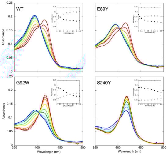 In light of this evidence and with the aim to demonstrate an effect of G92W and S240Y mutant on the structural dynamics of OleP, we examined the change of the UV-visible spectra of all OleP mutants bound to 6DEB as a function of sodium formate concentration (Figure 5). Increasing the ionic strength induces an increase in the absorbance at 387 nm and a decrease at 419 nm in all mutants, which is indicative of the conversion to the high-spin state as a consequence of the displacement of the axial water ligand from the heme iron (Figure 5).