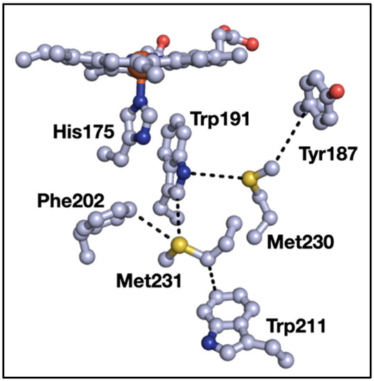 We previously surveyed sulfur–aromatic interactions in metalloproteins [9] and sulfur–aromatic interactions that involve two aromatic groups interacting with both lone pairs of sulfur [10]. During the course of those studies, we noticed a small but significant type of interaction where three aromatics clustered around the thioether of methionine (Met). At the time, we thought that these “3-bridge” clusters were outliers given the comparatively small size of sulfur (with respect to the aromatic groups), which we took as prohibitive in terms of interactions with three aromatic groups. However, ongoing work in our lab showed that such structures appeared in diverse proteins with different functions, and our focus solely on sulfur neglected other interactions of the Met-thioether. One such example is shown in Figure 1, where a bridging interaction exists between tryptophan 191 (Trp191), Met230, and tyrosine 187 (Tyr187) in yeast cytochrome c peroxidase (CcP) [11]. In addition, Met231 forms a bridging interaction with Trp191 and phenylalanine 202 (Phe202). Close inspection of the structure shows an interaction between the Met-CH2 and Trp211. Oxidation of either Met in the apo-protein alters the ability of the protein to make Compound I [12], and mutations alter the properties and stability of the Trp191 radical cation [13,14]. This example using CcP demonstrates some potential roles of Met–aromatic clusters in protein structure and function, which is the subject of this manuscript. Here, we provide a detailed analysis of the incidence and composition of 3-bridge clusters in structurally characterized proteins.