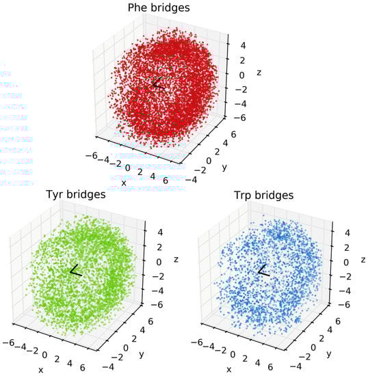 Analysis of the spatial orientations of the aromatic groups around Met are set out in Figure 3. The black V-shape at the center of the images denotes the CH3-S-CH2 thioether of Met. Each dot corresponds to an aromatic centroid. Note that this figure shows the raw incidences of Phe, Tyr, and Trp, regardless of the composition of the cluster. Images for the locations of aromatics in the different bridge compositions (i.e., Figure 2) are set out in the Supporting Information (see Figures S2–S11). While the search algorithm used a cutoff distance of 6 Å, the vast majority of hits occur at distances between 2 and 4 Å from the Met-CH3 or -CH2 to the aromatic ring. Note that the sum of the van der Waals radii of C and H is 2.9 Å. In all cases, the aromatic groups can be found widely distributed around the thioether, but there is a noticeably higher incidence of aromatics near the -CH3 and -CH2 groups (i.e., an interaction between a CH and a π system [35]). In some cases, this behavior is more apparent in isolated bridge compositions, for example, Phe, Trp, and Tyr clusters in Figure S4). While this work focuses on the incidences, basic features, and distance metrics of 3-bridge clusters, there also are angular correlations (e.g., between Met and faces of aromatics) that can be considered. This is the subject of our ongoing research.