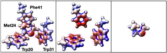 In order to better understand the inter-residue forces that are at play in 3-bridge clusters, quantum chemical calculations were carried out using an example of a 3-bridge cluster from a cytochrome P450 found in Thermobispora bispora (PDB ID 5VWS) [36]. Hydrogens were placed programmatically in PyMOL [37]. Hydrogen positions were optimized, and electron density plots calculated, using the ORCA ab initio quantum chemistry program [24,25]. Three versions of the bridge cluster were initially explored (Figure 4): the complete bridge, the aromatic groups only, and the Met only. As expected, the faces of the aromatic groups have partial negative charges and the edges have partial positive charges. Likewise, the sulfur in Met has a partial negative charge. However, the partial charges are more pronounced in the 3-bridge components (middle and right panel of Figure 4) than in the whole cluster. While the effect is subtle, the decrease in the magnitude of the electron density is consistent with a weak dipole–dipole (van der Waals) interaction. The greatest change in electron density in the aromatics is observed in Trp20 and in Phe41, which we revisit below. Overall, this is an example of how the polarizability of the Met thioether and the delocalized aromatic systems may facilitate interactions in the 3-bridge clusters. Such dipole–dipole interactions have also been noted in detailed calculations of simple models of benzene and dimethyl sulfide [19].
