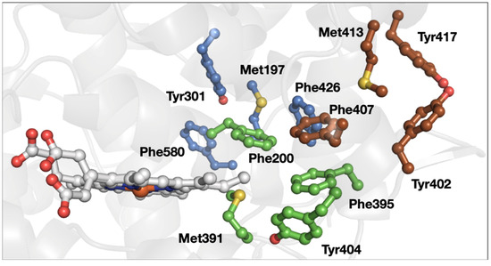 One example of a protein that contains multiple 3-bridge clusters is prostaglandin H2 synthase 1 (e.g., PDB ID 1Q4G [54], Figure 7). Three different 3-bridge clusters localize between the heme and the protein surface. This is a particularly unusual example because of the close spatial proximity of the bridges in a medium-sized protein. Two Tyr residues (Tyr402 and Tyr417) are localized at the protein surface, making them strong candidates for a protective role [45,46,47,48]. The Tyr involved in the catalytic cyclooxygenase reaction (Tyr385 in this protein, not shown in Figure 7) is located toward the protein interior. The third bridge, involving Met197, Tyr301, Phe426, and Phe580, connects several different parts of the primary structure, which is consistent with a role in promoting tertiary structure and the enzyme active site via weak dipole–dipole interactions.
