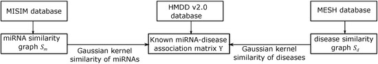 Let m and n denote the number of miRNAs and diseases, respectively, and denotes the miRNA-disease association matrix. if miRNA i has been known to be associated with disease j, otherwise . An algorithm predicating miRNA-disease associations requires matrix Y, along with miRNA similarity matrix (see Section 2.2) and disease similarity matrix (see Section 2.3), then ensures an optimal score matrix , where denotes the predicted score of the association between miRNA i and disease j. A higher score stands for a higher probability if miRNA i is associated with disease j.