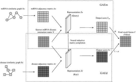In this paper, we propose an inductive matrix completion-based method to predict miRNA-disease associations. Varying from the previous study [18], the inductive matrix completion algorithm in our method is implemented through neural networks, so it is called neural inductive matrix completion. Li et al. [43] implemented a neural inductive matrix completion algorithm based on GCN [45]. In previous works [18,43,44], matrix completion algorithms or graph neural networks were assigned to compute the representations of miRNAs and diseases, then the prediction scores of miRNA-disease pairs were obtained through the dot product of miRNA representations and disease representations. Hence, these works ignored the label propagation procedure for inferring potential miRNA-disease associations. Yu et al. [20] proposed a matrix completion algorithm for low-rank subspace learning and assigned label propagation for miRNA-disease associations prediction. However, in [20], matrix completion and label propagation are separate procedures, leading to decrease their effectiveness. To address this issue, our method propose an end-to-end framework by graph autoencoders to integrate matrix completion and label propagation. Graph autoencoders on miRNA graph and disease graph are competent to reconstruct score matrix through initial association matrix, which is equivalent to propagating labels on graphs. Meanwhile, graph autoencoders on miRNA graph and disease graph are capable of low-rank representation learning from miRNA space and disease space, respectively. The two graph autoencoders are trained collaboratively via neural inductive matrix completion. Since Geng et al. [46] suggested that the attention mechanism is linked to matrix factorization, we illuminate that our inductive matrix completion-based method is an implementation of self-attention mechanism. In a word, our method implement a Neural Inductive Matrix completion-based method with Graph Autoencoders (GAE) and Self-Attention mechanism for miRNA-disease associations prediction. Our method, named NIMGSA, has the following advantages.