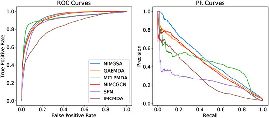 To further evaluate the performance of NIMGSA, we test our model at a high stringency level of specificity according to Equation (34). We fix specificity at 0.99, and then compute sensitivity, accuracy, precision, F1-score, and Mcc. The results are listed on Table 2, which illustrate that NIMGSA outperforms other methods at all five metrics. Matthews correlation coefficient (Mcc) is a comprehensive metric in binary classification on imbalanced data [41]. NIMGSA achieves an Mcc of 0.4273, which is higher than GAEMDA (0.4213), MCLPMDA (0.4138), NIMCGCN (0.3645), IMCMDA (0.3239), and SPM (0.2048).