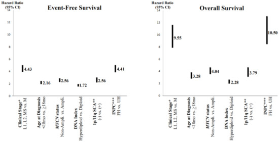 In order to predict a wide range of clinical behaviors of the patients with pNTs, there have been several risk grouping systems historically proposed by different cooperative groups, such as the International Society for Paediatric Oncology European Neuroblastoma (SIOPEN), the Gesellschaft für Paediatrische Onkologie und Haematologie (GPOH) and the Children’s Oncology Group (COG). Currently, two systems, the International Neuroblastoma Risk Group (INRG) and the COG risk classification system, are widely accepted; both are based on a combination of so-called prognostic factors, such as clinical stage, patient age at diagnosis, histopathology, and genetic and genomic/molecular properties. The INRG has been designed to facilitate the comparison of risk-based clinical trials conducted in different regions and countries and distinguishes very low (>85% survival), low (75–85% survival), intermediate (50–75% survival) and high-risk (<50% survival) patients [5], while the COG risk classification system has been used for the purpose of patient stratification and protocol assignment in international clinical trials [6,7]. Prognostic factors utilized in the latest and revised COG system include clinical staging, according to the INRG Staging System (INRGSS; Stages L1, L2, M and MS); age at diagnosis (new cut-off points at 365 days, 548 days and 5 years); histopathology, according to the INPC (favorable histology (FH) vs. unfavorable histology (UH)); MYCN oncogene status (non-amplified vs. amplified); DNA index (hyperdiploid vs. diploid); and segmental chromosomal aberrations (1p−, 11q−, 17q+; No vs. Yes) [8]. The hazard ratio by each prognostic factor is shown in the Figure 1 and the recent and revised COG neuroblastoma risk classification system is summarized in Figure 2 [8]. Treatment of patients in the low-risk group is often followed by observation (with no chemotherapy or radiation) after surgery or even biopsy alone. Intermediate-risk patients are treated with surgery or biopsy, followed by non-aggressive chemotherapy. High-risk patients are treated with intensive chemotherapy, surgery, radiation therapy, bone marrow/hematopoietic stem cell transplantation and biological-based therapies. The reported 5-year survival rates for non-high-risk and high-risk patients are around 90% and 50%, respectively [8].