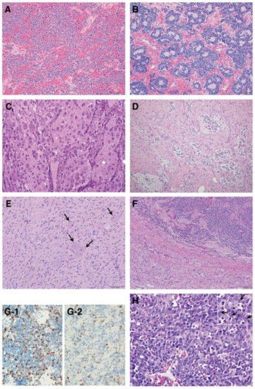 Histologic features of peripheral neuroblastic tumors: (A) neuroblastoma (Schwannian stroma-poor), undifferentiated subtype (original, ×200); (B) neuroblastoma (Schwannian stroma-poor), poorly differentiated subtype (original, ×200); (C) neuroblastoma (Schwannian stroma-poor), differentiating subtype (original, ×200); (D) ganglioneuroblastoma, intermixed (Schwannian stroma-rich) (original, ×100); (E) ganglioneuroma (Schwannian stroma-dominant)—note that completely mature ganglion cells are covered with satellite cells (arrows) (original, ×200); (F) ganglioneuroblastoma, nodular (composite, Schwannian stroma-rich/stroma-dominant and stroma-poor)—note two distinct histologies, i.e., neuroblastoma in the upper half and ganglioneuroma in the lower half in this case (original ×100); (G) Ki-67 immunostaining on two neuroblastomas of poorly differentiated subtype with a low mitosis–karyorrhexis index (original ×400). Note: (G-1) shows biopsy from rapidly enlarging liver of 3-month-old baby (Stage MS case, favorable histology) before starting spontaneous regression; (G-2) shows biopsy from abdominal mass of 5-year-old child (Stage M case, unfavorable histology). The favorable histology tumor contains numerous and more Ki-67 positive nuclei than the unfavorable histology tumor. (H) MYCN oncogene-amplified neuroblastoma demonstrating a characteristic histology of poorly differentiated subtype with a high mitosis–karyorrhexis index (original, ×400). Note: Tumor cells show nucleolar hypertrophy (Inset: prominent nucleoli indicated by arrows).
