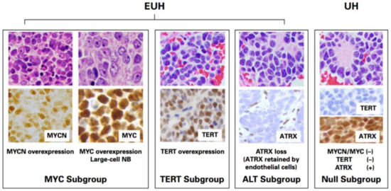 Proposed subgroupings of unfavorable histology neuroblastomas. Four subgroups, i.e., MYC (overexpressing either MYCN or MYC protein), TERT (TERT gene activation due to rearrangements), ALT (due to ATRX or DAXX loss) and null (no MYC, No TERT, no ALT), are distinguished immunohistochemically. EUH, extremely unfavorable histology; UH, unfavorable histology. The immunohistochemical grading of MYC-family protein expression was performed according to Ref. [25] using monoclonal anti-MYCN, NCM II 100 and anti-MYC, Y69. The evaluation of ATRX loss was performed when tumor cell nuclei were negative and endothelial cell nuclei (built-in-control) were positive in the same tumor tissue using polyclonal HPA001906. The immunohistochemical grading of TERT was performed essentially the same way as MYC-family proteins [25] using monoclonal A-6. (Adopted from the article by Ikegaki and Shimada, JCO Precis Oncol 2019;3:PO18.00312 [24] with the publisher’s permission.). (All images, original ×600).