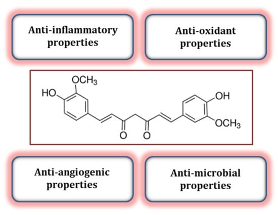 Chemical structure of curcumin (1,7-bis(4-hydroxy-3-methoxyphenyl)-1,6-heptadiene-3,5-dione). Curcumin which is found in the rhizome of Curcuma longa (turmeric) as a strong natural polyphenol, has a number of biological activities, including antioxidant (could inhibit ROS-generating enzymes) and anti-inflammatory (could block NF-κB activation) properties, anti-cancer, anti-obesity, and anti-infertility effects [].