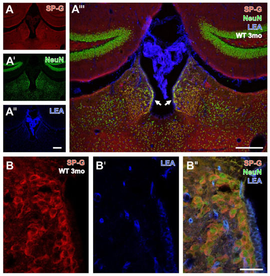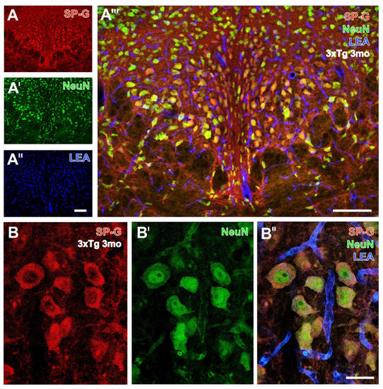 Triple fluorescence labeling of SP-G, LEA-positive vessels, and NeuN in the hypothalamus from a 3 month-old 3xTg mouse. Numerous SP-G-containing neurons of considerably differing sizes are visible in the medial hypothalamus around the posterior hypothalamic nucleus (and around the 3rd ventricle) in (A), while NeuN immunolabeling (A’) reveals by nuclear staining even more nerve cells. Concomitant detection of LEA-binding sites (A’’) shows evenly distributed vessels throughout the presented regions. In the overlay (A’’’), a larger portion of neurons displays a green nucleus surrounded by a red SP-immunopositive rim. Notably, some neurons without cut nuclei appear red only. Higher magnified confocal laser scanning micrographs show SP-G-ir predominantly in the rim of nerve cells (B) co-expressing NeuN (B’), which becomes even clearer in the overlay also showing the LEA-stained vasculature (B’’). Scale bars: A’’ (also valid for A,A’) = 100 µm, A’’’ = 100 µm, B’’ (also valid for B,B’) = 25 µm.