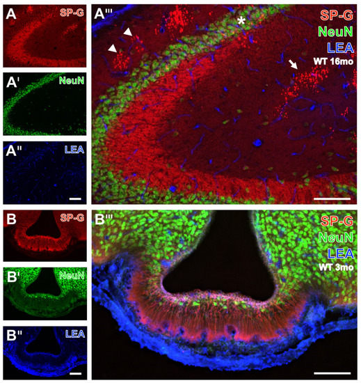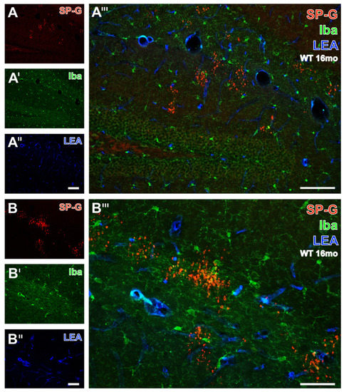 Subsequently, Figure 5 exemplifies the concomitant fluorescence labeling of SP-G, LEA-positive vessels and microglial Iba by images from the hippocampus of a 16 month-old WT mouse. Numerous SP-G-immunoreactive dots were observed in stratum lacunosum-moleculare of the CA1 field, the molecular layer of the dentate gyrus (Figure 5A), and at a higher magnification in the stratum lacunosum-moleculare of the CA2 region (Figure 5B). In parallel, Iba-immunoreactive microglia (Figure 5A’,B’) were found regularly distributed in the presented regions. Additional STL-staining (Figure 5A’’,B’’) revealed the vasculature. The overlay (Figure 5A’’’) elucidated several larger perpendicularly cut vessels adjoining to clustered SP-G-immunoreactive dots on the border between the strata lacunosum-moleculare and radiatum. In addition, the nearly general absence of co-occurring SP-G and Iba became obvious. Both overlays (Figure 5A’’’,B’’’) clearly show that the SP-G-immunopositive dots are devoid of Iba-ir, which was exclusively found in ramified microglia.