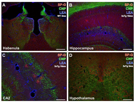 Concomitant fluorescence staining of SP-G, LEA-positive vessels, and oligodendroglial CNP in different forebrain regions. In (A), both hemispheres of the habenula from a 3 month-old WT mouse exhibit heavy SP-G labeling that appears strongest in its medial part. More ventrally and medially located intermediodorsal, lateral posterior, parafascicular nuclei, and the posterior complex of the thalamus also display numerous SP-G-containing cells. Further, the immunolabeling of CNP demonstrates many fibrous structures and is most prominent in the striae medullares but is absent in the paraventricular thalamic nucleus. Counterstaining of LEA appears strongest around the ventricle and is moderate in numerous vessels. Note the absence of structures co-expressing SP-G and CNP, as indicated by the lack of the mixed color yellow. The hippocampus of a 16 month-old 3xTg-AD mouse in (B) is absent from noticeable cellular SP-G-ir but the neuropil of the gyrus dentatus and strata lacunosum-moleculare and radiatum are faintly stained. In contrast, the strata oriens, lacunosum-moleculare, and radiatum of the CA1 field, as well as the granular layer of the dentate gyrus, contain numerous clusters of SP-G-immunopositive dots. CNP counterstaining reveals massively labeled white matter as well as weaker stained fine processes of the granular layer and coarser structures in the dentate gyrus—intermingled by SP-G-dots and bordered by vessels of the LEA-positive fissura hippocampalis. At a higher magnification, the hippocampal CA2 region from the same old transgenic animal (C) shows largely the same spatial relationships between the stained markers as (B). Similarly, the lower magnified hypothalamus of a 3 month-old 3xTg-AD mouse (D) exhibits SP-G-ir of cells embedded within CNP-immunoreactive processes without co-labeling of both markers in the posterior hypothalamic nucleus. Scale bars: C = 100 µm, D (also valid for A,B) = 200 µm.