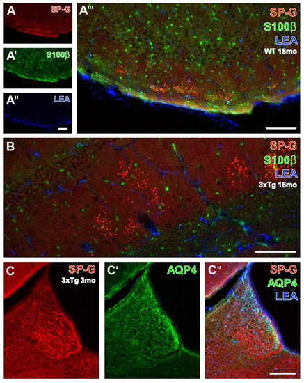 Without exception, the counterstained, evenly distributed, S100β-immunoreactive astroglia and vascular LEA-binding sites were distinct from SP-G-ir in cells and dots (Figure 6A’–A’’’). On the contrary, the habenula of a young 3xTg-AD mouse (Figure 6C–C’’) displayed cellular SP-G-ir, while AQP4-immunolabeled vessels were predominantly located in the medial habenula close to the ventricle. The merge of staining patterns also indicated the close vicinity of AQP-4-ir and LEA-binding sites in vessels, with a turquoise appearance.