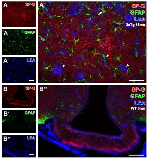 Next, triple fluorescence staining of SP-G-ir, LEA-binding sites and GFAP was first exemplified by the higher magnified hippocampal CA1 region from a 16 month-old 3xTg mouse (Figure 7A–A’’’).