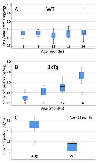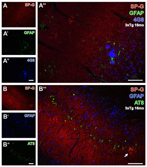The second aspect of this study, elucidating changes of SP-G under pathological conditions, was based on 3xTg mice mimicking aspects of AD, which were introduced by LaFerla and coworkers [14], and age-matched WT mice without transgenes, but otherwise representing the same genetic background. In 3xTg mice, the inserted mutated human transgenes for presenilin-1, APP1, and tau (e.g., PS1M146V, APPSwedish mutation, and tauP301L) cause synaptic deficits, including disturbed long-term potentiation prior to Aβ deposits and hyperphosphorylated tau, for instance, in the hippocampus [45]. While Aβ deposits are primarily observed in the neocortex and progress to the hippocampus, tau pathology is first apparent in the hippocampus and then spread to the cortex [46]. Notably, intraneuronal accumulation of Aβ precedes extracellular Aβ deposition [47], which is in line with reports of early intracellular Aβx-42 in the human brain [48] and in APP/PS1 mice [49], and is considered as a predictor for synaptic dysfunction frequently caused by Aβ oligomers [23,50]. Mastrangelo and Bowers confirmed the predominant restriction of Aβ plaques and hyperphosphorylated tau to the hippocampus, amygdala, and cerebral cortex—the main foci of AD neuropathology in humans—in a comprehensive study [46]. Next, the light and electron microscopic analysis of AD-like pathology in 3xTg mice included the detection of epitopes for abnormally altered tau, and revealed intraneuronal immunoreactivity, for instance, for Alz50, MC1, AT8, and PHF-1 at already 3 weeks of age, whereas straight filaments appeared only in 23 month-old female mice [51]. Based on breeding pairs kindly provided by Drs. LaFerla and Oddo, in 2005, animals from our own breeding elucidated persistently detectable AD-like lesions in aged 3xTg mice and revealed plaques with differently N- and C-terminally truncated Aβ species in 3xTg mice, hardly differing from deposits in senile macaques, baboons, and human cases [52]. Twelve month-old mice displayed hippocampal Aβ deposits in close vicinity to neurons filled with AT8-immunopositive phospho-tau [53].