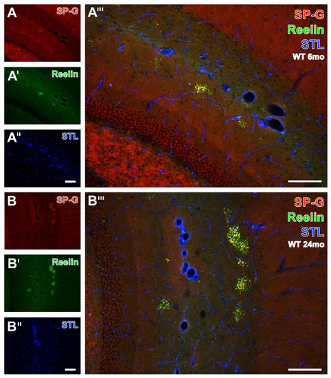 For the semiquantitative analyses of the clustered dots, hippocampal sections from all animals were double-immunolabeled for SP-G- and Reelin, and the vasculature was counterstained with STL. The apparently age-dependent occurrence of dots was exemplified by comparison of the staining patterns in WT mice aged 6 months (Figure 9A–A’’’) and 24 months (Figure 9B–B’’’). The rostral hippocampus of the younger animal displayed SP-G-ir (Figure 9A) only in the stratum lacunosum-moleculare of the CA1-region. Here, the SP-G-ir dots were frequently not clustered. In parallel, Reelin immunolabeling visualized obviously more numerous dot-like structures (Figure 9A’) in the aforementioned stratum lacunosum-moleculare. Concomitant STL staining (Figure 9A’’) also detected larger vessels in the fissura hippocampalis. Merged staining patterns at a higher magnification (Figure 9A’’’) revealed dot-like structures labeled by Reelin only (green) or containing both SP-G and Reelin (yellow). A representative image of the caudal hippocampus from a 24 month-old WT mouse elucidated clustered dots in the strata radiata of the CA3 and CA1 regions immunopositive for SP-G (Figure 9B) and Reelin (Figure 9B’), separated by the STL-stained fissura hippocampalis. The magnified overlay shows mostly yellowish-appearing dots containing both SP-G and Reelin. Notably, clusters of dots containing SP-G-ir and Reelin-ir were also observed in the piriform cortex (data not shown).