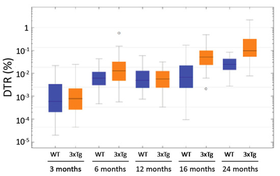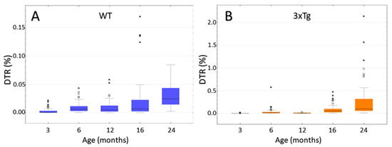 In the age groups of 6, 16, and ca. 24 months, the comparison of the two genotypes (Figure 11) showed significantly increased DTRs in the 3xTg mice (p < 0.001 in the Mann-Whitney-U Test). Remarkably, some 6 month-old 3xTg animals exhibited DTRs higher than the median DTR of 24 month-old WT-mice. These “outliers” were clearly isolated cases, but such exceptions were not detected within the control group of WT animals. As mentioned above, the DTR increased over the course of aging in both 3xTg and WT mice, but this increase is much lower in the latter ones. When comparing the 6 month-old animals, the median DTR was 2.07 times larger in the 3xTg mice than in the WT group (0.0129% vs. 0.0062%). This factor increased to 7.66 when comparing 16 month-old 3xTg mice with their age-matched control group (0.0520% vs. 0.0068%). The median DTR of ca. 24 month-old 3xTg-mice was 3.98 times greater than the DTR of WT animals of the same age group (0.0977% vs. 0.0245%).