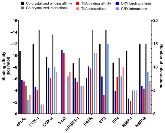 Binding energy and number of interactions made by the co-crystallized ligand (if available), TIIA, and CRY with each target.