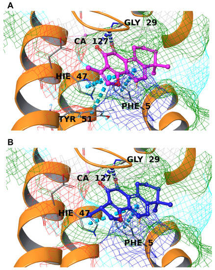 The chemical structure of the secondary metabolites considered in this work is reported in Figure 1. Both these lipophilic compounds are diterpenoid containing a tetrahydronaphthalene moiety (rings A and B) fused to an ortho-quinone (ring C) and a furan or dihydrofuran (ring D) for TIIA and CRY, respectively [79]. The small difference in ring D between the two secondary metabolites makes the TIIA structure planar and rigid, preventing the ring from bending to accommodate inside the pocket, and form additional interactions similar to COX-2, and MMP-2 (vide infra).