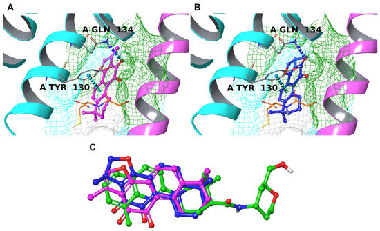 mPGES-1 is a homotrimer that, therefore, contains three distinct binding sites located at the interface between two chains and contains a GSH molecule as a co-substrate in each cavity. As reported [19,65,90,91,103], the binding site is delimited by Arg70, Arg110, Arg126, Ser127, Tyr130, Thr131, and Gln134 on chain A and Tyr28, Ile32, Arg38, Phe44, Asp49, and His53 on chain B. The cavity is small, and it is partially occupied by the GSH molecule, which interacts with a head group of the substrate PGH2, causing the lipophilic tails to accommodate outside the binding site [19]. From the visual inspection of the binding poses, the two compounds established interesting interactions with Tyr130chainA and Gln134chainA, preventing access to GSH (Figure 7A,B), and were arranged like the co-crystallized inhibitor (Figure 7C). Interestingly, CRY, due to its chemical structure, is able to orientate its methyl moiety towards a hydrophobic cavity formed on chain B (pink ribbons in Figure 7A,B), improving the overall quality of the binding with the counterpart.