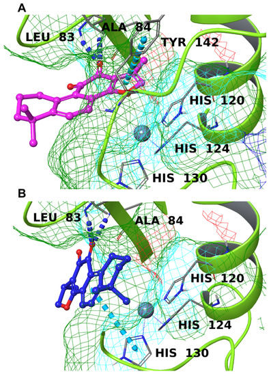 From the data reported in Figure 3, it was clear that neither TIIA nor CRY showed an adequate binding to MMP-1 due to the high polarity of the binding surface, which prevented a good accommodation of these lipophilic compounds inside the cavity (data not shown). Concerning MMP-2, the data were slightly better, though not satisfactory. Both molecules made two hydrogen bonds with Leu83 and Ala84, through one of the carbonyl oxygens, and a π-π stacking with Tyr142 and His130, respectively, for TIIA and CRY (Figure 11). Despite the interactions with relevant amino acids, the spatial arrangement these two compounds showed was not optimal: the considerable polarity of the pocket prevented the good insertion of TIIA and CRY, leaving them in the shallow part of the binding site.