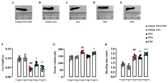 The effect of TIIA and CRY was investigated on platelet activation by performing an ex vivo model of clot retraction. Results from this in vivo model were assessed macroscopically by the evaluation of clot morphology (Figure 14A–E) and numerically (clot score) by clot weights and residual serum volumes. It was observed that samples from TIIA- and CRY-treated mice (10 mg/kg; i.p.) were much less retracted (TIIA: 0.068 ± 0.009 g, p ≤ 0.05; CRY: 0.048 ± 0.011 g, p ≤ 0.01) compared to the vehicle group (0.096 ± 0.009 g), suggesting that both diterpenoids significantly decreased the clot retraction rates of platelets. A similar effect was found for ASA-treated mice (0.042 ± 0.008 g vs. 0.099 ± 0.012 g, p ≤ 0.01) (Figure 14F). Congruently, as shown in Figure 14G, the CRY-treated group resulted in a more prominent production of serum compared to the vehicle group (171.0 ± 7.35 μL vs. 139 ± 12.08 μL, p ≤ 0.05). Successively, in order to support the hypothesis that both diterpenoids could affect hemostasis and thrombus formation, in vivo tail bleeding assay was performed [106]. As shown in Figure 14H, pretreatment with TIIA and CRY significantly increased the bleeding time in mice (TIIA: 2.07 ± 0.17 min, p ≤ 0.01; CRY: 2.44 ± 0.12 min, p ≤ 0.001) compared to the vehicle group (1.33 ± 0.14 min). Similar results were observed after ASA administration (2.07 ± 0.22 min vs. 1.04 ± 0.19 min, p ≤ 0.01).