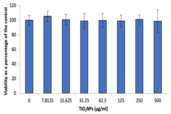The XTT assay used to evaluate potential cytotoxicity of TiO2NPs after 48 h, indicated no effect on viability after the cells were exposed to the NP range assessed in this study (Figure 3).