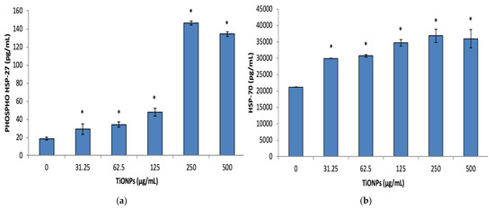 The cell stress biomarkers phospho-HSP-27 and HSP-70 notably increased (p < 0.001) at concentrations ≥31.25 μg/mL TiO2NPs. Phospho-HSP-27 levels doubled at 31.25 μg/mL TiO2NPs and tripled at 125 μg/mL TiO2NPs, compared to the 0 μg/mL TiO2NP control, and then increased to 7-fold at 250 and 500 μg/mL TiO2NPs (Figure 5a). However, with regards to the HSP-70 levels, there was a notable dose-dependent increase in the secretion of this biomarker (Figure 5b). HSP-70 levels were also noted to be a 1000× higher in comparison with the phospho-HSP-27 levels.