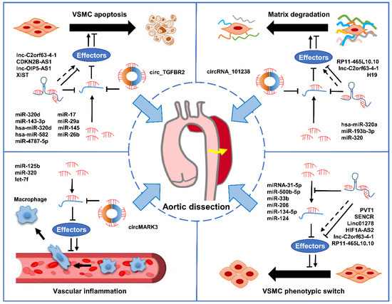 The mechanisms of ncRNAs involved in AD progression. The dysregulation of miRNAs, lncRNAs, and circRNAs contributes to AD progression by modulating crucial biological progresses, including phenotypic transformation and apoptosis of VSMCs, extracellular matrix degradation, and vascular inflammation.